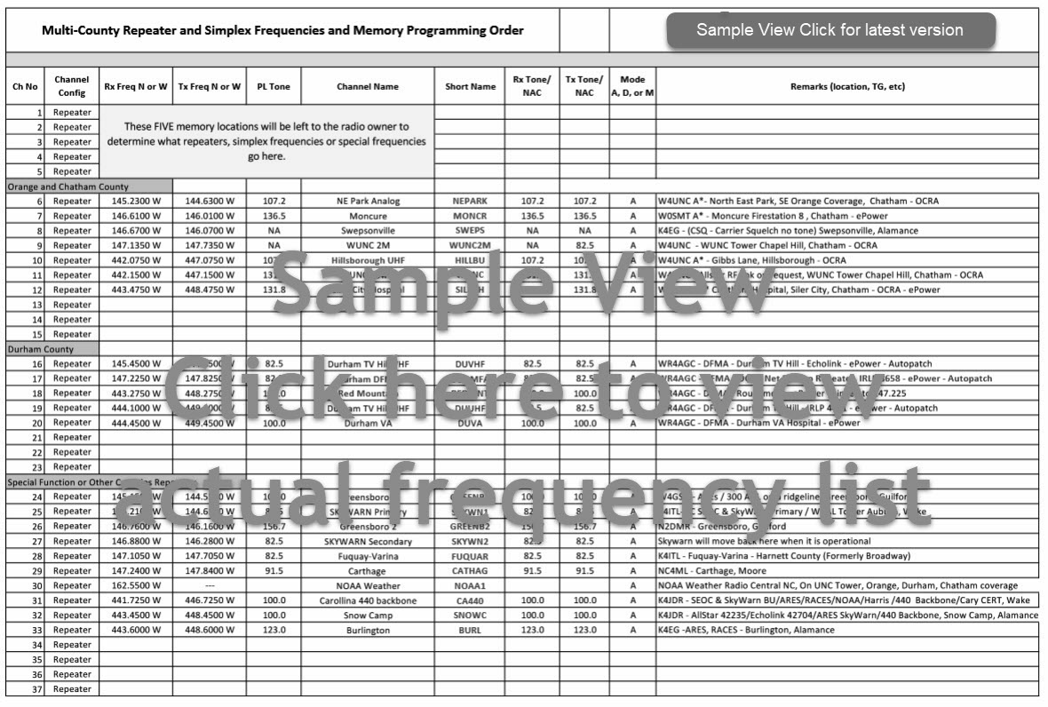 Operational. Located in Moncure courtesy of W0SMT FCC trustee providing coverage across Chatham County, Lee County and significant portions of Orange County. This repeater can be linked to the AllStar repeaters listed here for emergency service training and use. (Channel 7) | ||||